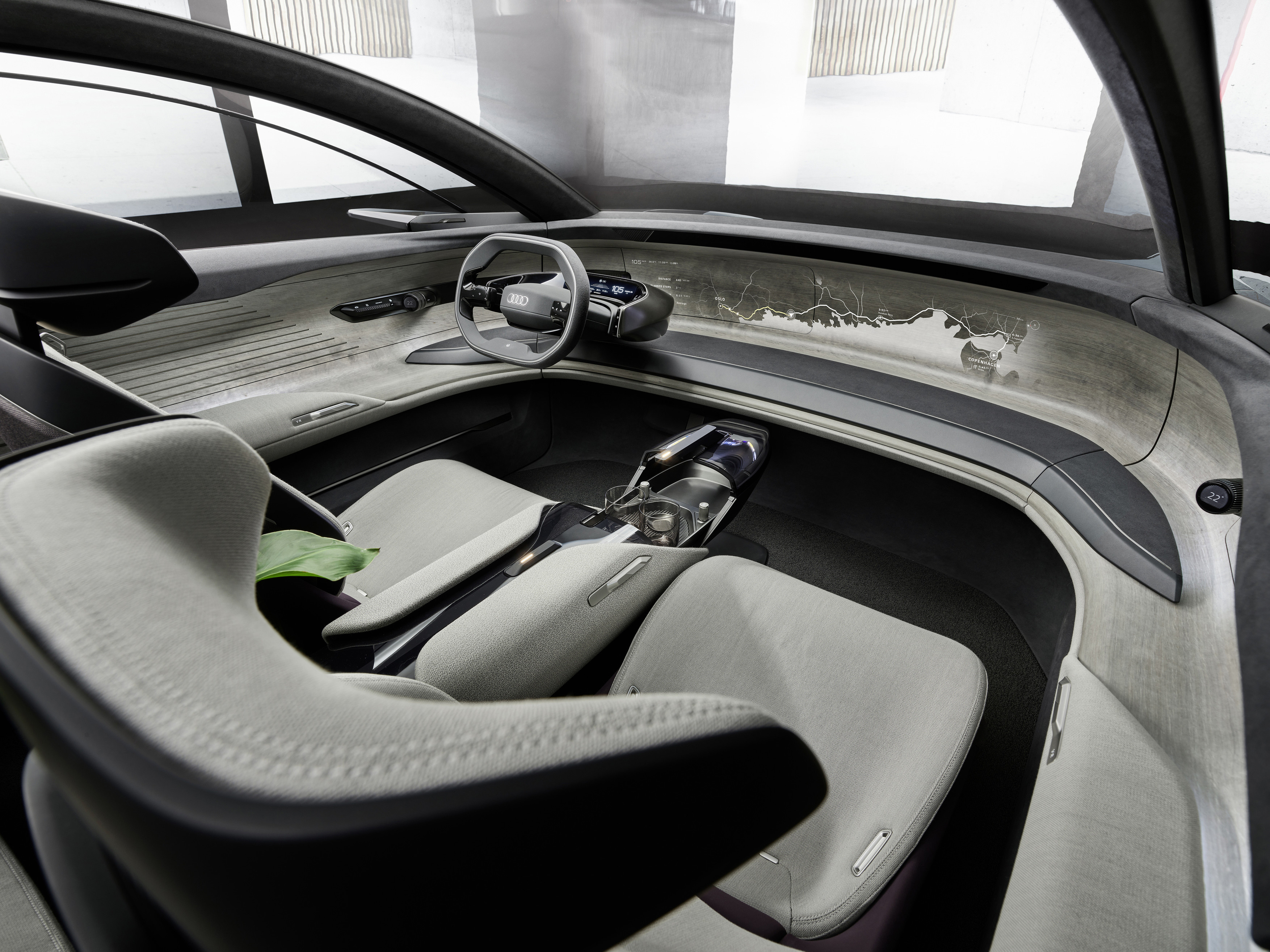 此外,车门的扶手内也集成有控制面板。因此,车辆可始终为乘客提供载有视觉信息的触摸屏,并通过光学指示器显示其位置。同时,在左右车门扶手两侧还配有 VR 眼镜,可与信息娱乐系统搭配使用。